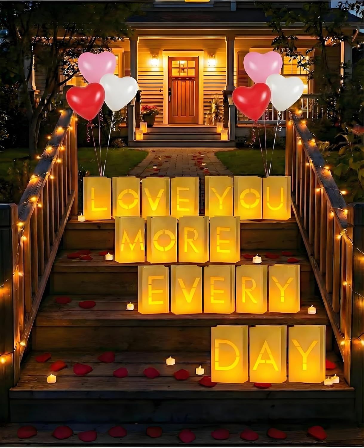| Included Components | 12 x Heart Balloons, 19 x Alphabet Luminary Bags, 2000 x Rose Petals, 40 x LED Tea Lights, Ribbon, Adhesive Dots, Blowing Pipe |