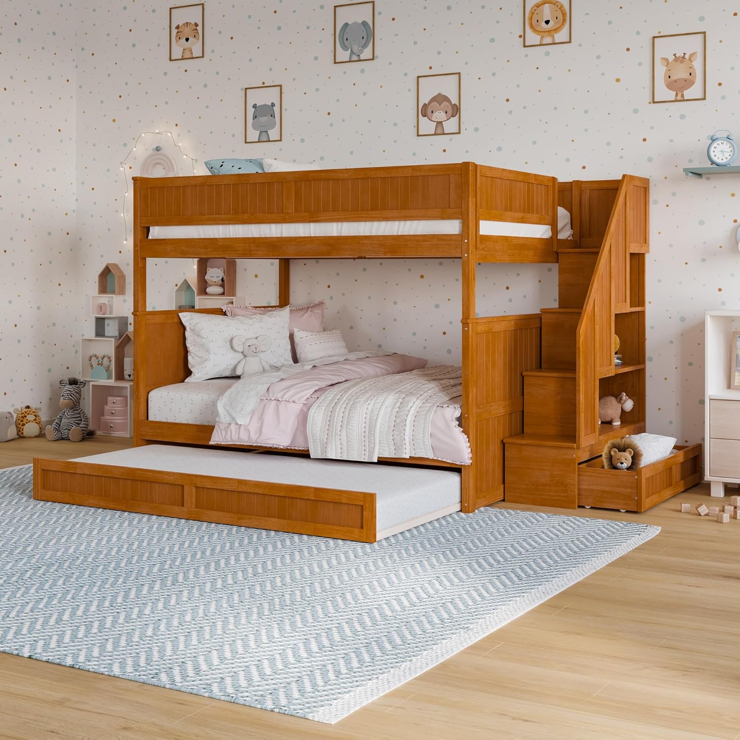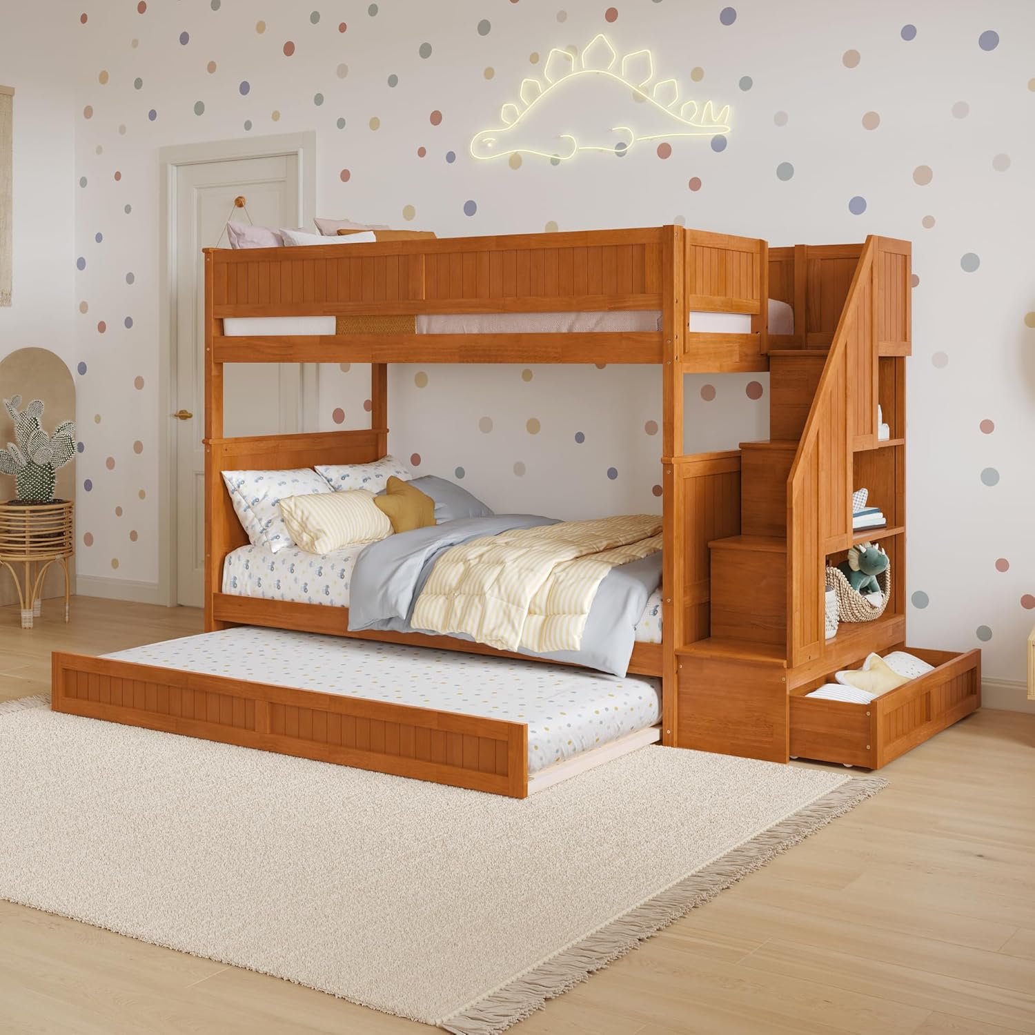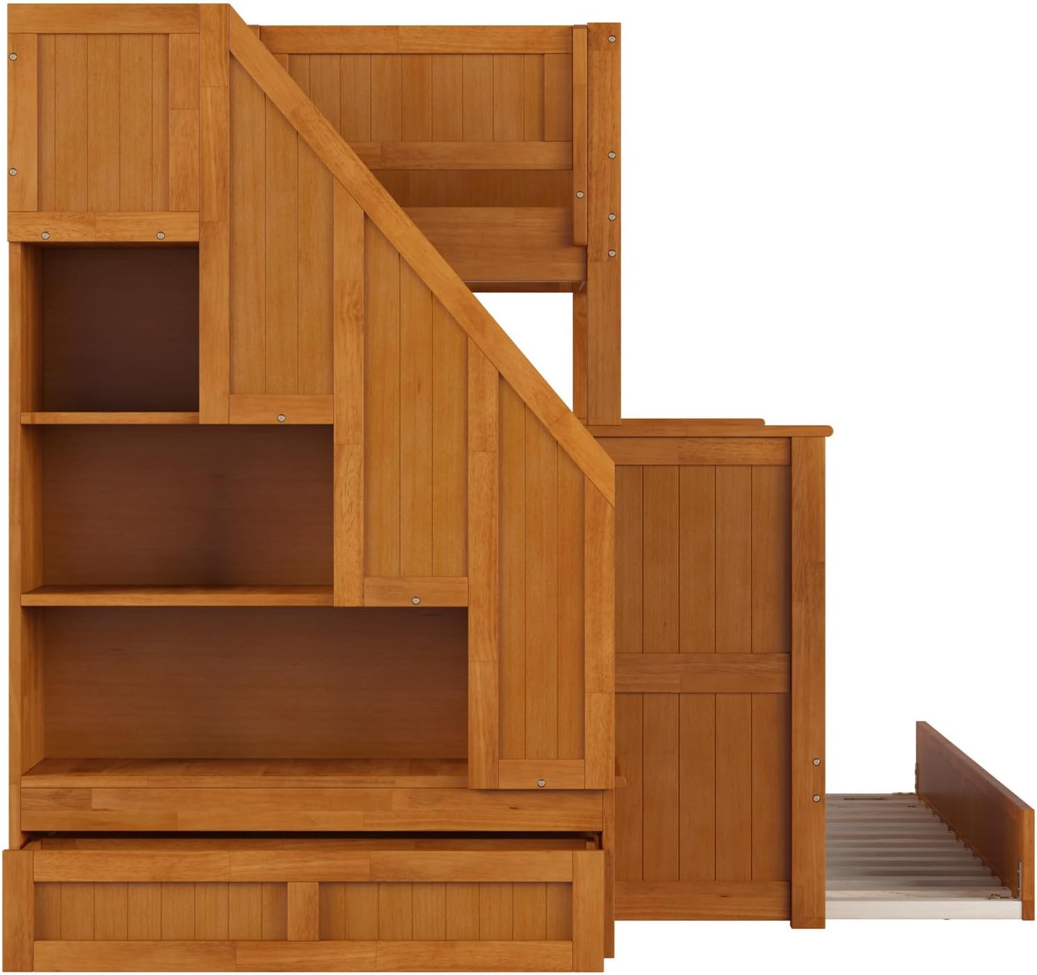 Create a fun and functional space for your kids with the Dover Staircase Bunk Bed! Available in Twin over Twin, Twin over Full, and Full over Full sizes, this charming wooden bunk bed comes in White, Walnut, and Light Toffee finishes to complement any decor. Designed with a built-in staircase that doubles as a storage hub, it includes shelves and a drawer to keep essentials organized. Plus, the convenient Twin trundle provides extra sleeping space, perfect for hosting friends and making sleepovers a breeze. With its sturdy build and playful design, the Dover is ideal for growing kids who need extra room for books, toys, and more.