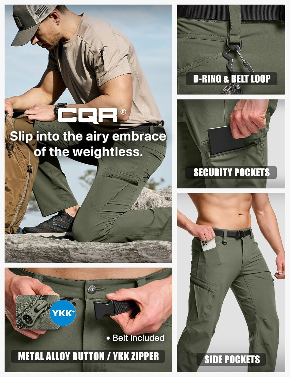 CQR Outdoor Adventure Pants SeriesSuitable for hiking, running, jogging, cycling, motorcycling, climbing, and other training/sports activities.Materials Spandex mixed fabric supports your movement to provide comfort during outdoor activities.BreathabilityMesh ventilation system allowing air to circulate and wick away moisture.Body Geometry Fit3D pattern design allows maximized mobility and top tear fit.Multi-purpose PocketsMulti pockets for various tools and equipment.