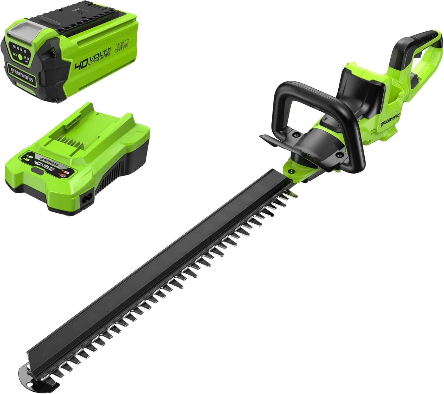 "The Greenworks 40V 24-Inch Cordless Hedge Trimmer is a lightweight and powerful tool designed for professional trimming and yard maintenance, featuring a 1” cutting capacity and a 2.0Ah USB battery with charger for extended runtime and eco-friendly operation. Perfect for homeowners and landscaping professionals, this cordless hedge trimmer delivers precise cuts and clean edges, making it ideal for shaping hedges, trimming shrubs, and maintaining a well-groomed yard. With its ergonomic design, low-noise performance, and hassle-free maintenance, it’s the ultimate choice for achieving professional results without the mess or hassle of traditional tools. High-Frequency & Long-Tail Keywords: Cordless Hedge Trimmer: Provides unmatched portability and convenience. 1” Cutting Capacity: Ensures clean and efficient cuts for thick branches. Lightweight & Powerful: Reduces user fatigue while delivering high performance. Professional Trimming & Yard Maintenance: Perfect for maintaining a neat and tidy yard. 2.0Ah USB Battery & Charger: Ensures long-lasting power and quick recharging. Eco-Friendly Design: No gas, no oil, and low noise for a cleaner environment. Ergonomic & Low-Noise: Enhances comfort and reduces disturbance during use."