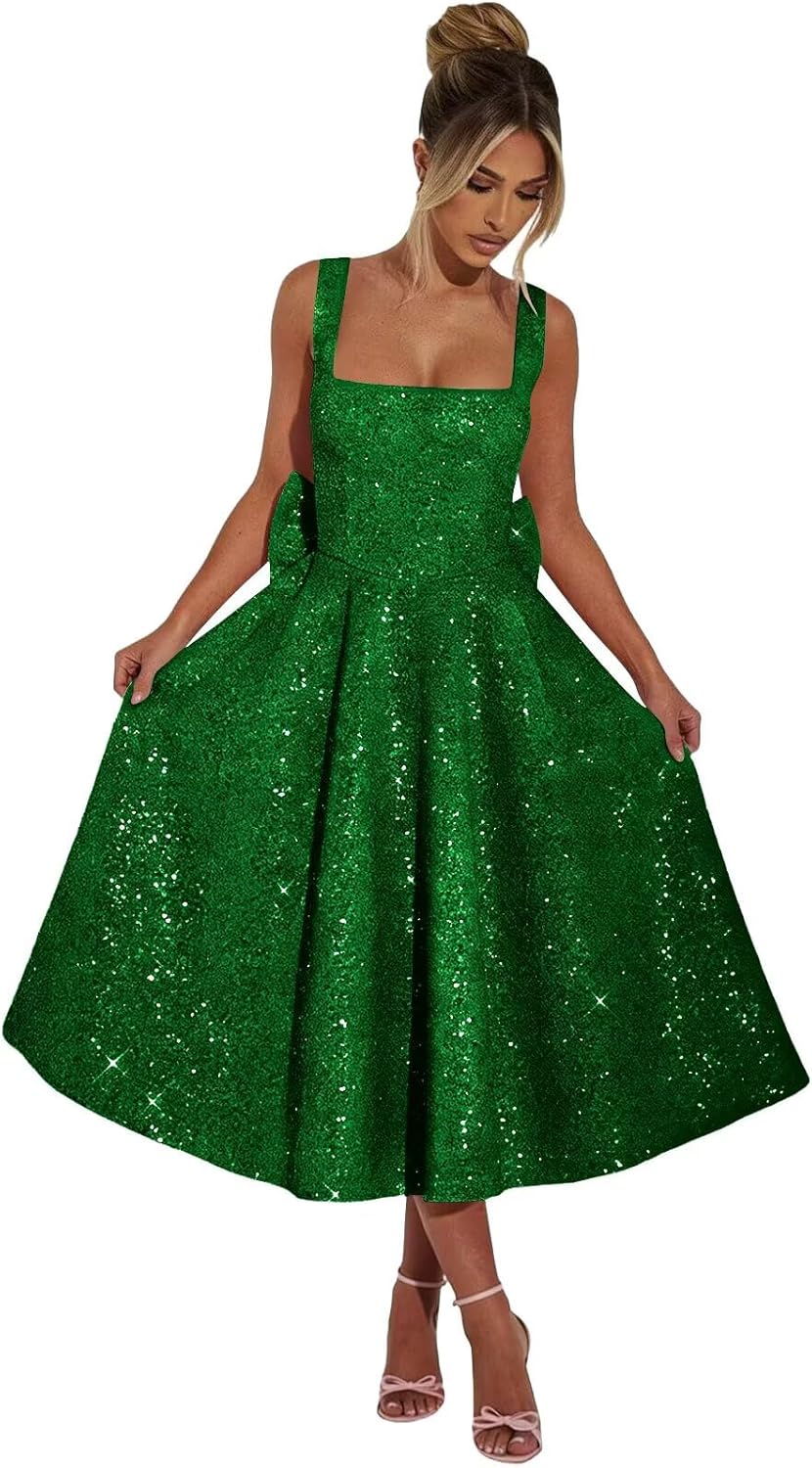 | Embellishment Feature | A Line, Big Bow, Shoulder Straps, Square Neck, Tea Length |