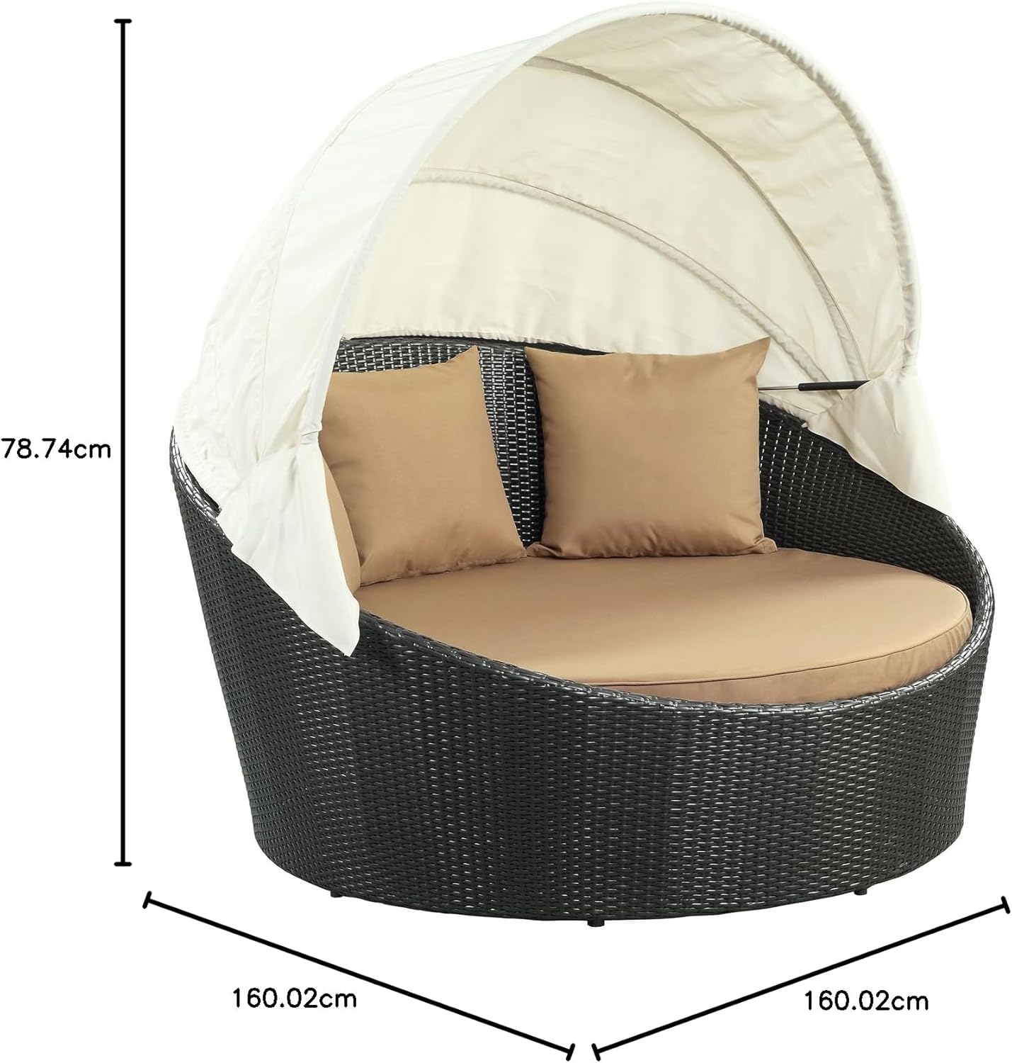 Awaken from your daytime repast while comfortably ensconced in this boundless elliptical daybed. Return to newly focused strength and vigor with an affluent all-weather white cushion and retractable sun guard. Siesta's modern form shows that, independent of everything, your space in the world is determined by your ability to make the most out of revitalized pursuits. Set Includes: One - Siesta Outdoor Wicker Patio Canopy Bed Three - Siesta Outdoor Wicker Patio Throw Pillows Product Dimensions: Overall Product Dimensions: 63"L x 63"W x 31"H Seat Height: 14"H Back Height: 30"H Armrest Dimensions: 1"W x 22"H.