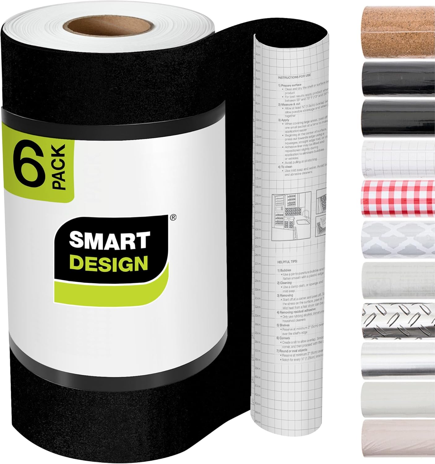 Smart Design Shelf Liners - Set of 6 - 120' Total Shelf Liners cushion and protect your surfaces and home goods from everyday wear and tear. Our selection of colors and designs will add style and freshen up your shelves, drawers and closets. Package Includes (6 Rolls) - 120' Total Decorative Adhesive Shelf Liner. For covering shelves, cabinets, closets, drawers, arts & crafts. Features and Benefits Easy to cut, peel, and apply to flat surfaces. Washable and wipes clean w/ a damp cloth. Product Specifications Roll Size: 18 Inches x 20 Feet Color: Multicolor Selections Material: Durable and Washable Material Design: Peel Adhesive