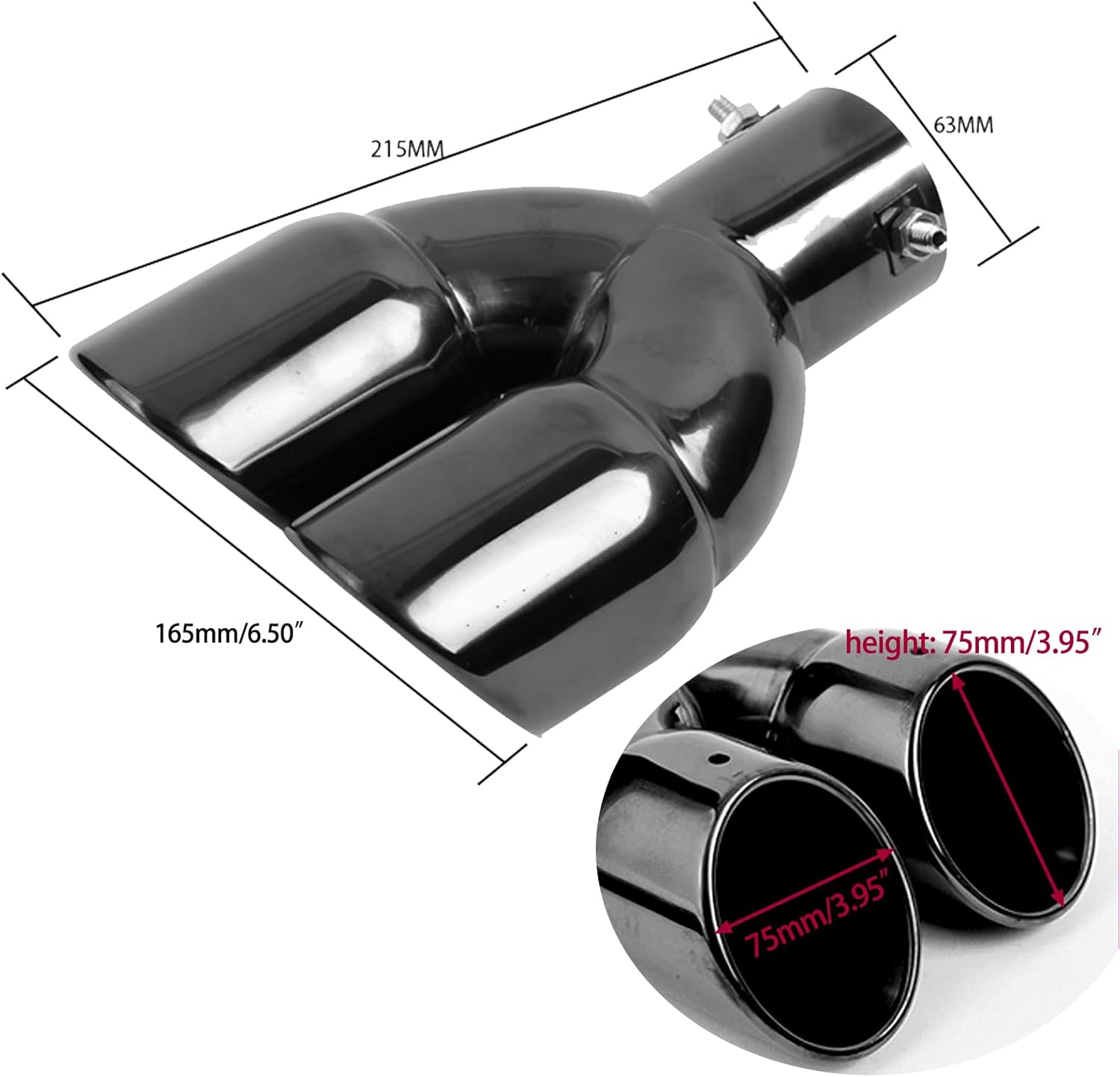 Good Performance Guaranteed. High Quality and 100% Brand New Double Exhaust Muffler Exhaust Tip Product descriptions: As a decorative product for cars, stainless steel exhaust tip 2.5 inch can not only protect the exhaust pipe from corrosion and impact. Also decorate the car, increase the beauty of the car and improve the driving experience. It is the best choice for car modification. The inner tank is made of thick, high quality stainless steel and polished, which is corrosion resistant, rust resistant, light weight and durable. The outer diameter of the end is 63 mm(2.5in) .The inner diameter of the end is 60 mm(2.36in). For exhaust pipes with an outer diameter of 38-54mm(1.5-2.1in), try to slide the tip onto the exhaust pipe and then tighten the clamp with a wrench. For exhaust pipes with an outer diameter of 55-60mm (2.1-2.36in), it is recommended to be fastened by welding. Please make sure the meter before placing this order. br> Package includes: 1x stainless steel exhaust Notes: 1. To avoid injury, use it when installing with a glove. 2. It is very safe, but you should check it regularly. 3. Please allow 0.5 inch difference due to manual measurement. (1 inch 2,54 cm)