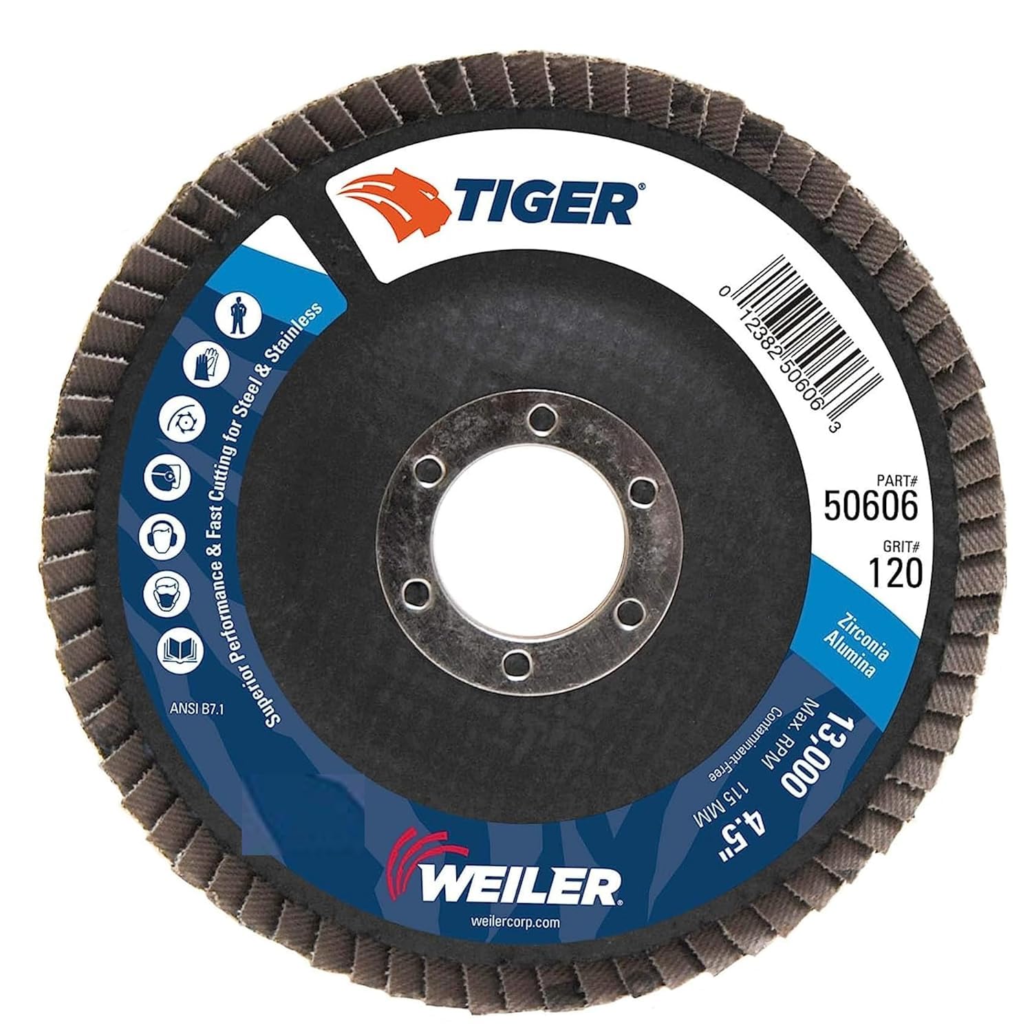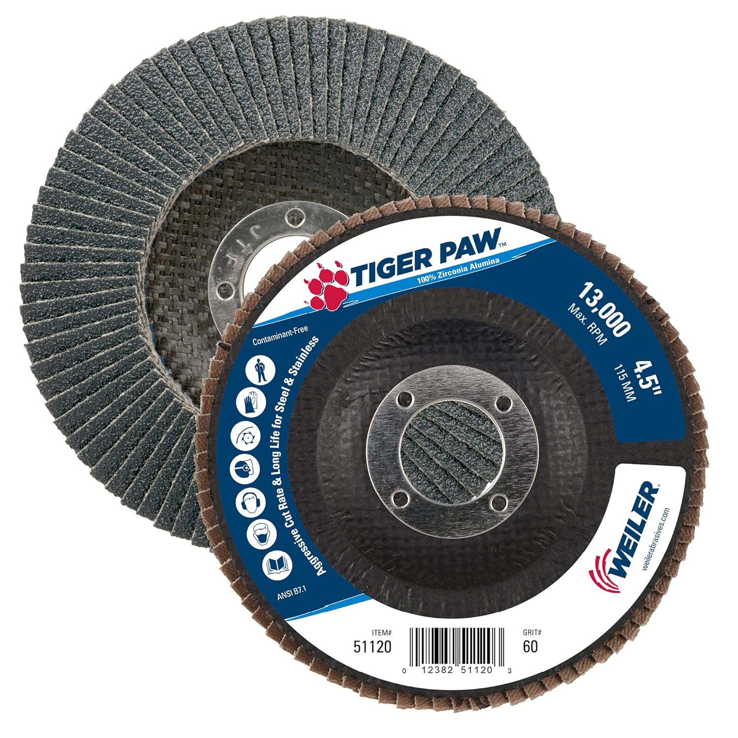 Weiler Tiger Paw flap discs are designed for the user looking for aggressive performance and long life in heavy-duty applications like edge grinding. 100 percent zirconium grain is fast cutting with long life, resulting in fewer change overs and increased productivity. Superior grain retention - lasts longer and maintains perfect cutting angle to provide excellent performance and sustained stock removal when grinding on-edge. Engineered poly/cotton cloth features excellent grain retention for maximum disc life. Phenolic prevents backing from scratching the workpiece. Zirconium grain features multi- crystal, fast cut rate, self- sharpening, stands up to heavy pressure and high temperatures and high rate of stock removal and long life in demanding applications. Smooth action and long life; for heavy - duty applications on steel and stainless.